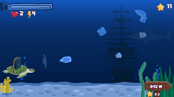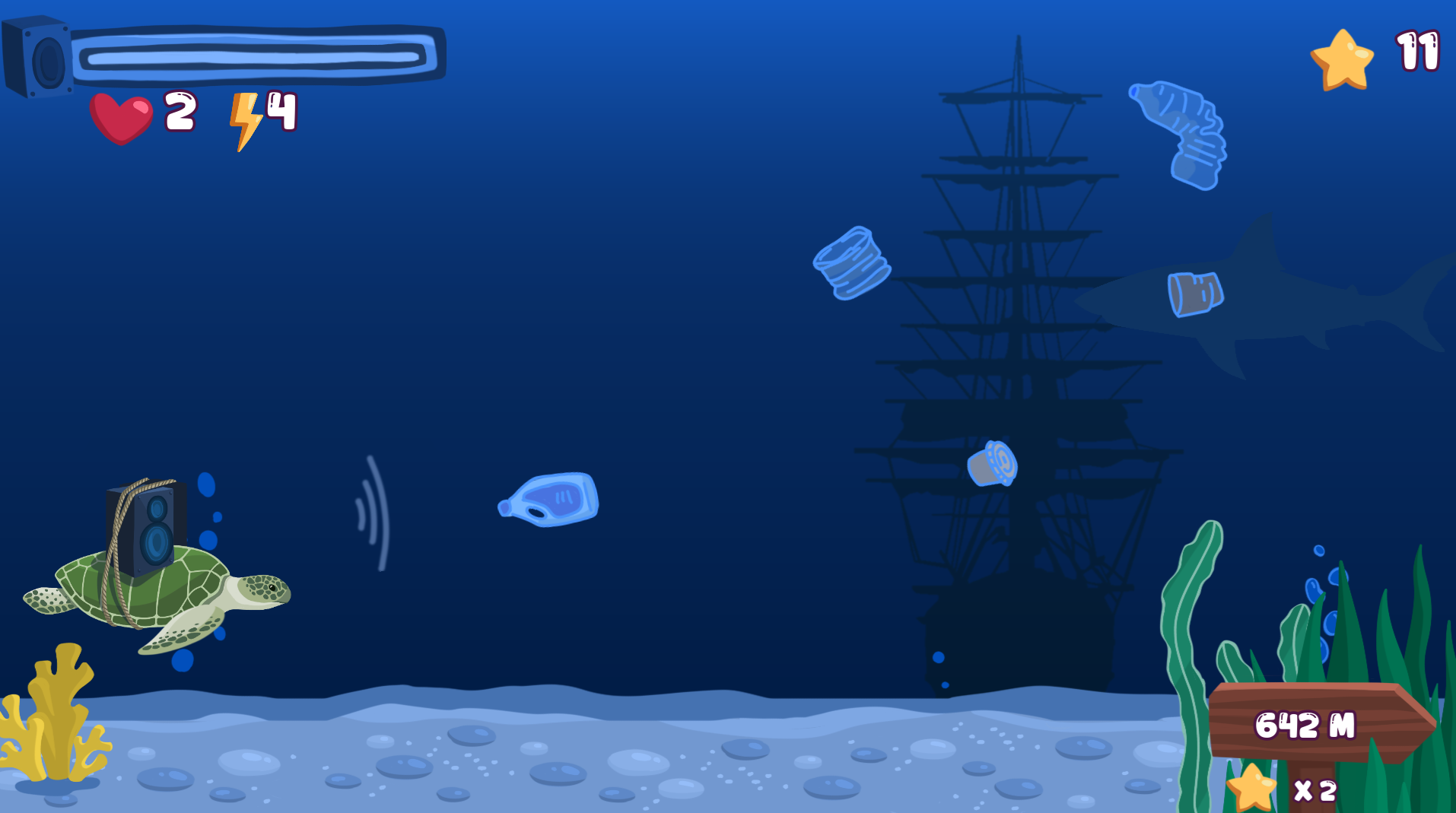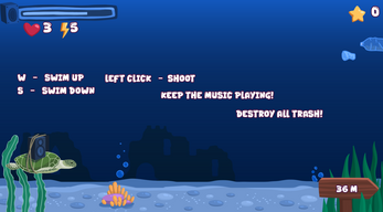 You play as a heavy metal blasting turtle who has to keep the music playing and destroy all of the trash that has polluted his seabed.